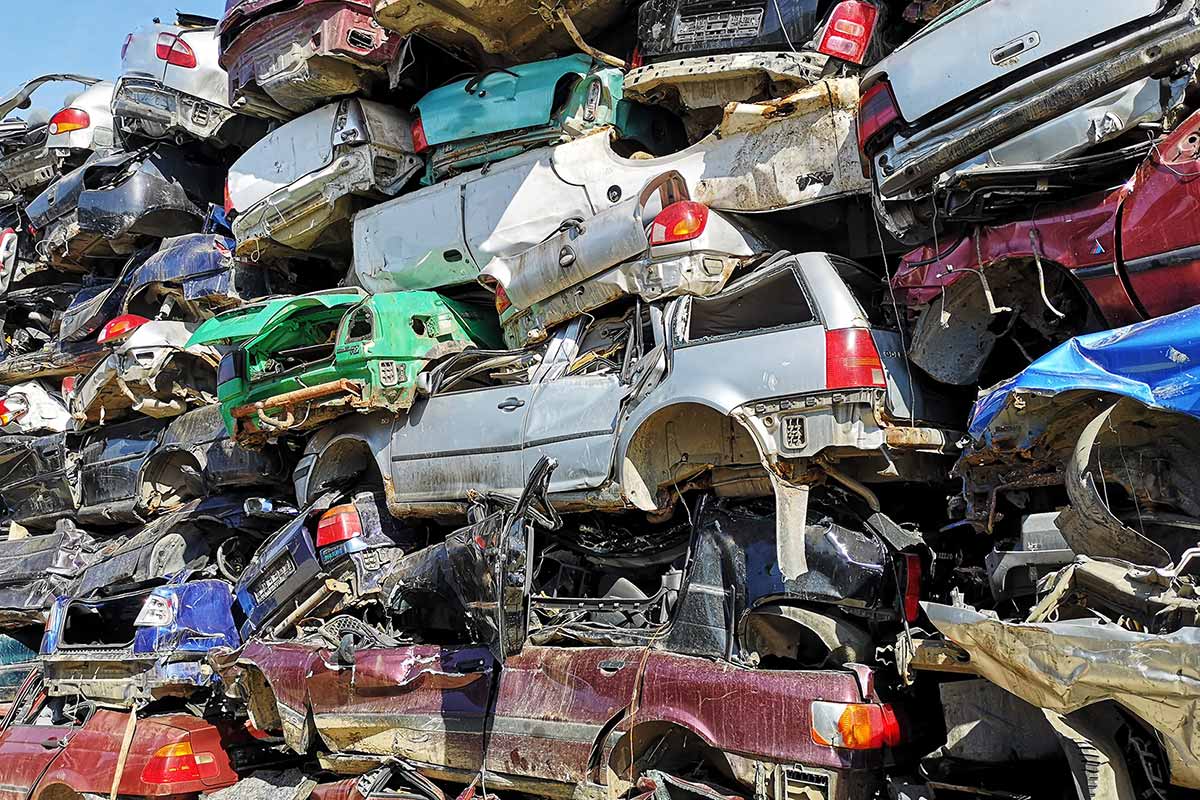 Scrapped vehicle frames and outer body shells made primarily of steel, processed for metal recovery.